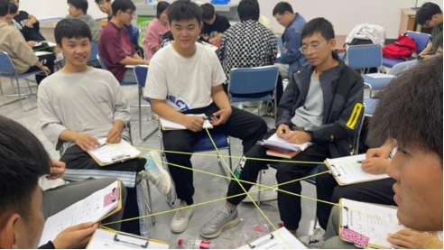 接下来是“扑克分组”,抽到了相同数字或者相邻数字的同学们被分为一组,拉近同学们相识的进程。随后通过“毛线球连线”引导小组成员自我介绍。不同小组的线绕出了各式各样的图案,代表着大家有着不同的行为风格与处事方式。一根线,串连起了一颗颗炽热真诚的心灵,提高了同学之间的凝聚力。