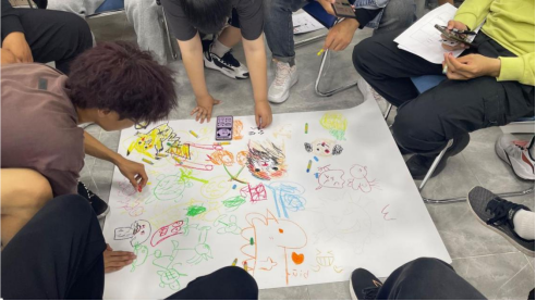 随后,是“无声自由作画”环节。以组为单位在上面进行涂鸦,在没有交流的前提下,同学们的奇思妙想得到释放展现,寓意着独一无二的同学们相聚于机电这张“白纸”下,共同绘就出多彩绘卷。