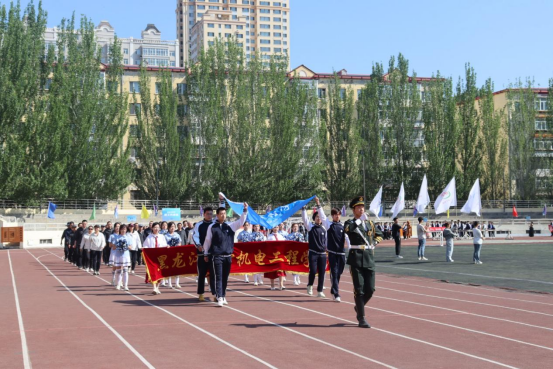 上午8时许,伴随着激昂奋进的运动员进行曲,前导队迈着坚定的步伐引领各方队入场。教工方队和各班级方队迈着整齐划一的步伐、喊着振奋人心的口号走向主席台接受检阅,他们坚定自信,充分展现了机电师生勤奋求实、勇于开拓的精神风貌。教工代表队走在方队最前列,学院全体教职员工精神抖擞、斗志昂扬,展现了为学院发展建设担当作为、奋楫争先、拼搏自强的卓越风采。各班级员工代表队排着整齐的队伍,朝气蓬勃、昂首阔步、意气风发地走过主席台,他们铿锵有力的口号,喊出了新时代青年挺膺担当的强国心声。“春风得意正少年”,他们期待着能在本届运动会中挑战自我、超越自我。