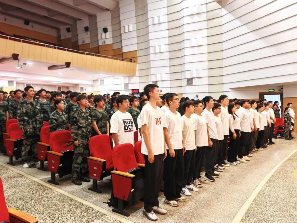 随着庄严的国歌声响起,全体起立,合唱国歌。2025级新生开学典礼正式开始。