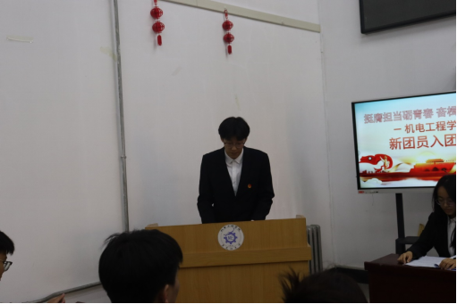 2022级机械设计制造及其自动化专业一班袁驿博同学作为新团员代表发言。他表达了自己成为一名新团员的激动与自豪,他说道:“成为共青团员,意味着人生道路上的一次更新更高更远的起航,我们要以此为起点,向上生长,向下扎根,不断发光发热”。